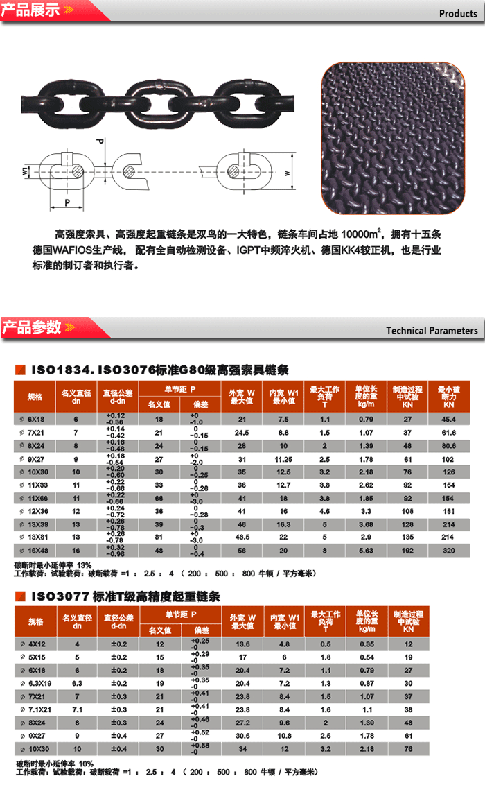 高強度索具、高強度起重鏈條式雙鳥的一大特色,鏈條車間占地10000平方米,擁有十五條德國WAFIOS生產線,配有全自動檢測設備、IGPT中頻淬火機、德國KK4矯正機,也是行業標準的制定者和執行者。